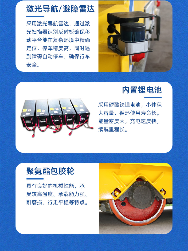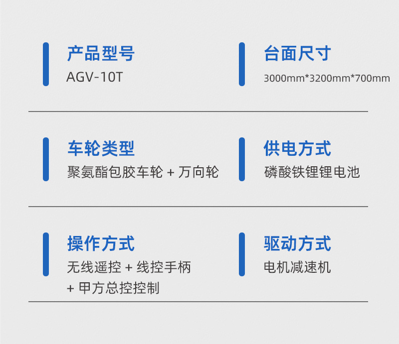 智杰优搬运为自动化生产线设备输送研发制造的重载AGV自动化搬运车,长3米宽3.2米高0.7米额定载重10吨,主要用于运输设备进行自动化生产线对接作业,采用先进的激光导航技术,通过激光扫描器识别反射板确保移动平台能在复杂环境中精确定位,提高生产线对接的精确度,台面定制辊筒装置,根据程序设定可自主完成物料的装卸和传送,无需人工干预,采用PLC控制系统,运行路线设有5个停靠点,停车精度高可达正负10mm,设有无线通讯可连接甲方系统总控控制进行远程操控,锂电池供电续航里程长,智能充电桩自动充电,除自动化运行模式外支持无线遥控作业,轮系采用聚氨酯包胶轮搭配万向轮,可全向运行,差速转向灵活稳定,**装置设有避障雷达、声光报警、防撞触边、急停开关等保护,AGV自动化搬运车的运用与现有的输送线无缝对接,形成一个完整的自动化工作流,减少物料在生产线中的停滞时间,提升整体生产效率!