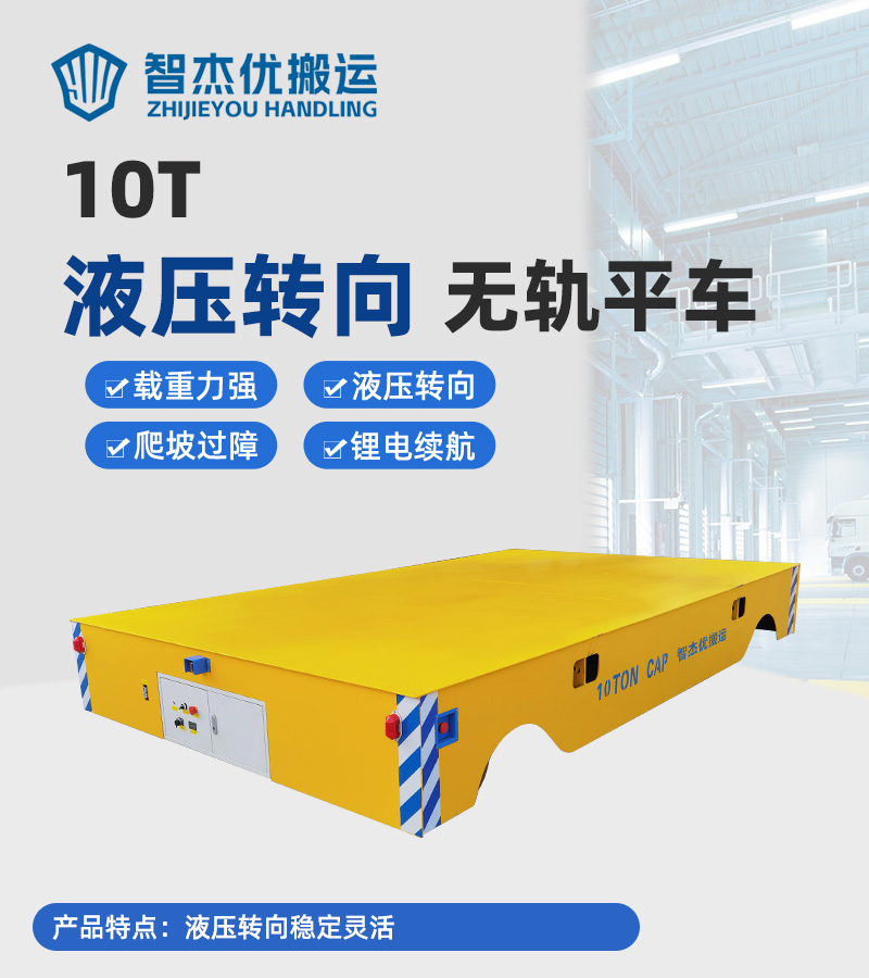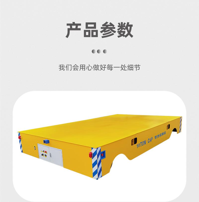 液压转向无轨搬运车,长4米宽2.4米高0.8米额定载重10吨,整车箱梁结构钢板焊接,载重量大不易变形,满载状态下,无轨车运行平稳、性能稳定!采用锂电池供电续航时间长充电时间短,智能充电桩充满自动断电,运行速度按客户要求满载0-35m/min,空载0-40m/min,运行速度可调节,轮系采用聚氨酯包胶轮适应水泥地面运行,液压转向稳定灵活,客户现场有6-8度上坡路段,车辆满载状态下轻松上坡动力强劲,**装置配备光电检测自动避障、声光报警、急停开关、防撞块等**保护,确保平车**往返运输作业!