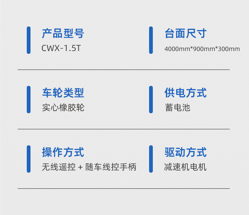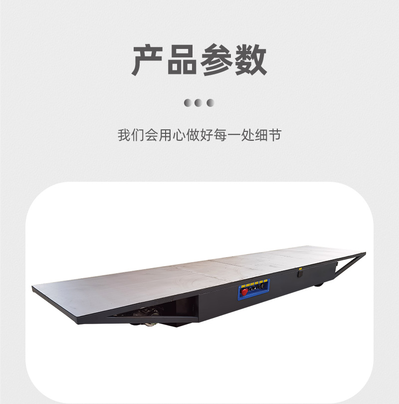 液压转向无轨搬运车,整车长4米宽0.9米高0.3米额定载重1.5吨,该车作为大型演出中移动舞台之用,采用蓄电池供电,满载运行不低于2小时,无线遥控操作简单方便,运行速度为1米每秒,无极调速通过拨动摇杆力度大小控制行车速度,采用液压转向,阻力小转向灵活,转向过后车轮具有自动回正功能,轮系配备实心橡胶轮防滑耐磨耐刺穿,适应多种路面运行,满足户外使用要求,可在50mm深水中运行,**可靠性能稳定。电磁刹车制动响应灵敏,**装置设有急停开关、声光报警等保护,确保行车**。