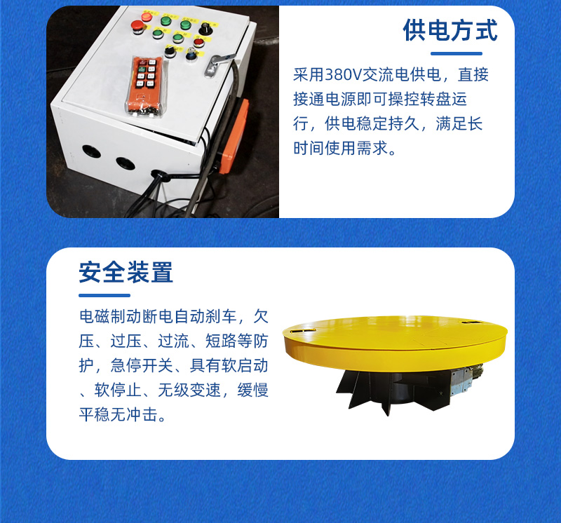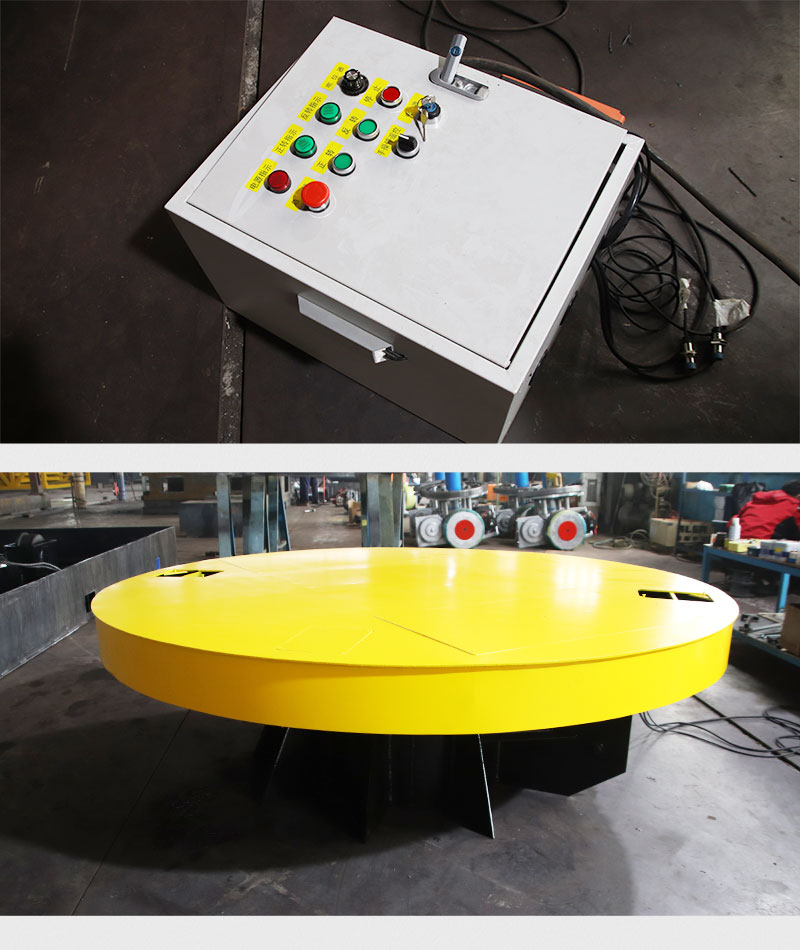 智杰优搬运生产制造的工业重载电动转盘平车换向旋转台,转盘直径2米高1.3米额定载重5吨,主要用于工业生产车间道岔口地轨车的90°换向,采用控制柜按钮操作,简单方便。380v交流电供电可满足随时使用需求,电动转向转弯灵活稳定承重力强,一般安装于基础底坑内,转盘与地面齐平,轨道对接精准,方便上方地轨车进行换向行驶,该系列电动转盘可根据实际需求进行定制双轨道、十字交叉轨道,也可平台台面用于大型机械装备的装配等使用。