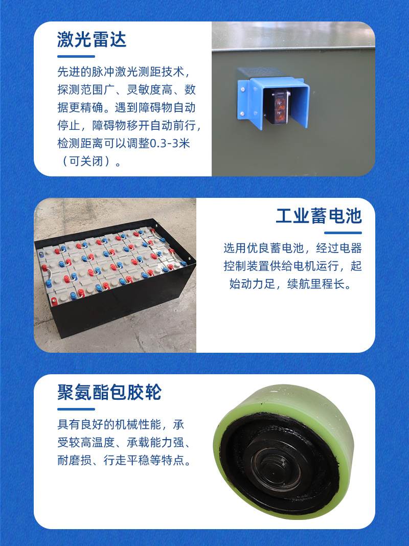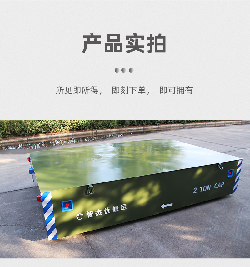 工件转运无轨车室外电动搬运车,长3米宽2米高0.6米额定载重2吨,主要用于工件的转运作业,蓄电池供电运行路线自由可跨车间运输,平车设有电量显示表,电压低于30%时报警提示充电,智能充电机充满自动断电,无线遥控操作平车前进后退、左转右转、原地旋转等运动控制,聚氨酯包胶轮适应多种路面运行,可在狭窄空间复杂工况下稳定作业,**装置设有声光报警、急停开关、光电检测遇到障碍自动停车,确保平车**平稳运输。