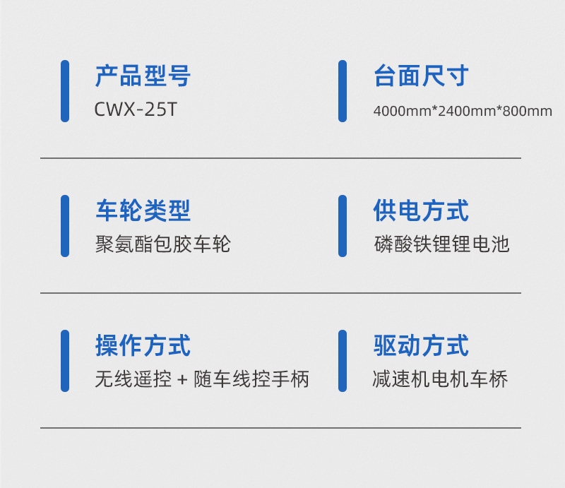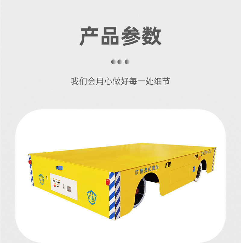 无轨电动平板车模具转运车出厂前运行测试实拍,长4米宽2.4米高0.8米额定载重25吨,客户主要用于模具的跨车间转运作业,锂电池供电续航里程长充电时间短,无线遥控操作前进后退左转右转,液压转向灵活轻便容易维护,采用电机车桥驱动,性能稳定可靠,高扭矩输出传动效率高驱动力足,车桥驱动系统通过性好,负载力强,即使在摩擦力较大的路面也能**运行,室外运行具备一定爬坡能力,聚氨酯包胶车轮防滑耐磨弹性好适用性强,前后安装光电检测遇到障碍自动停车,声光报警急停开关**性高