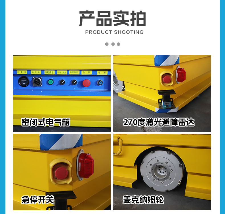 智杰优搬运生产制造的麦克纳姆轮全向无轨地平车,长3.6米宽1.2米高0.4米额定载重1.5吨,客户用于搭载检测设备对产品进行检测使用。伺服电机驱动实现精确的位置、速度和转矩控制,无线摇杆操作简单,麦克纳姆轮支持原地旋转、左右横移、米字斜行、前进后退,可在狭窄作业环境下精准到达指定位置,蓄电池供电容量大配备智能充电机电流平稳,电磁制动响应灵敏,270度避障激光雷达,扫描到障碍物自动停车,障碍物移开自动前进,声光报警急停开关**性高,同时具有欠压、过压、过流、过载、低电量提醒等平车保护。