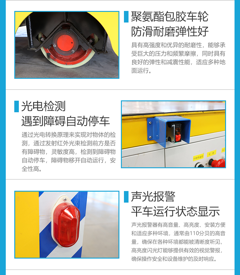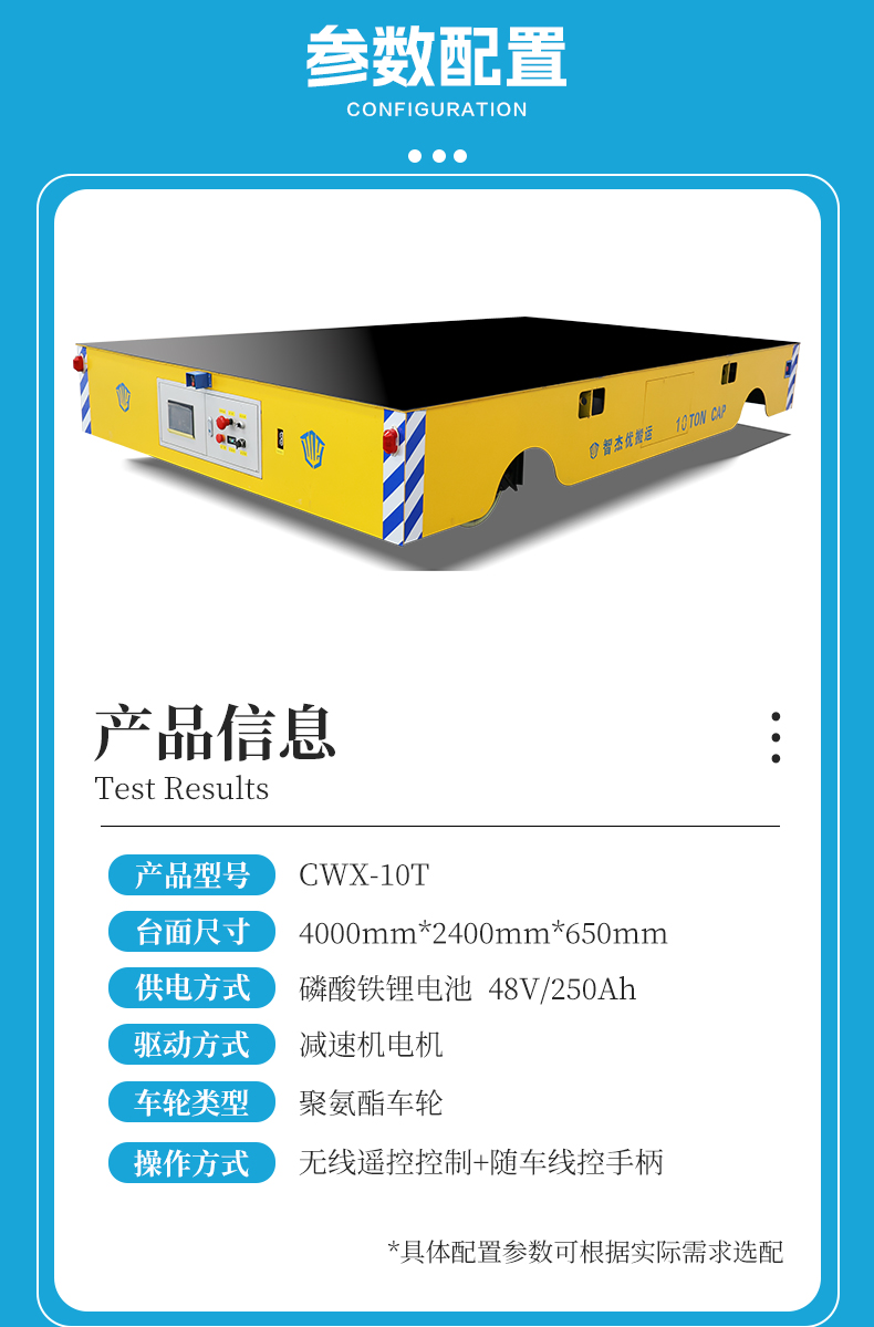 10吨工件搬运无轨车车间运输平板车,长4米宽2.4米高0.65米,车架箱梁结构结实耐用可搬运10吨的货物。台面安装橡胶防滑垫方便工件放置,锂电池供电容量大续航时间长,设有人机交互显示屏,实时显示车辆状态及故障信息,可手动调节平车参数功能设置,无线遥控操作可前进后退、左转右转,聚氨酯包胶轮防滑耐磨适应水泥地面运行,差速转向精准灵活转弯半径小,适用于空间有限的作业环境中,**装置设有光电检测自动避障,声光报警急停开关,欠压、过压、过流等防护,是生产车间不可或缺的重型物料搬运工具。