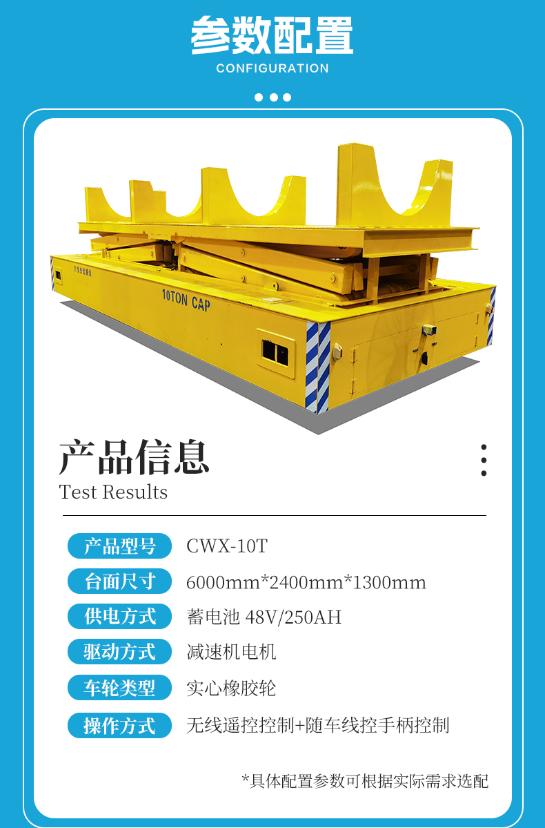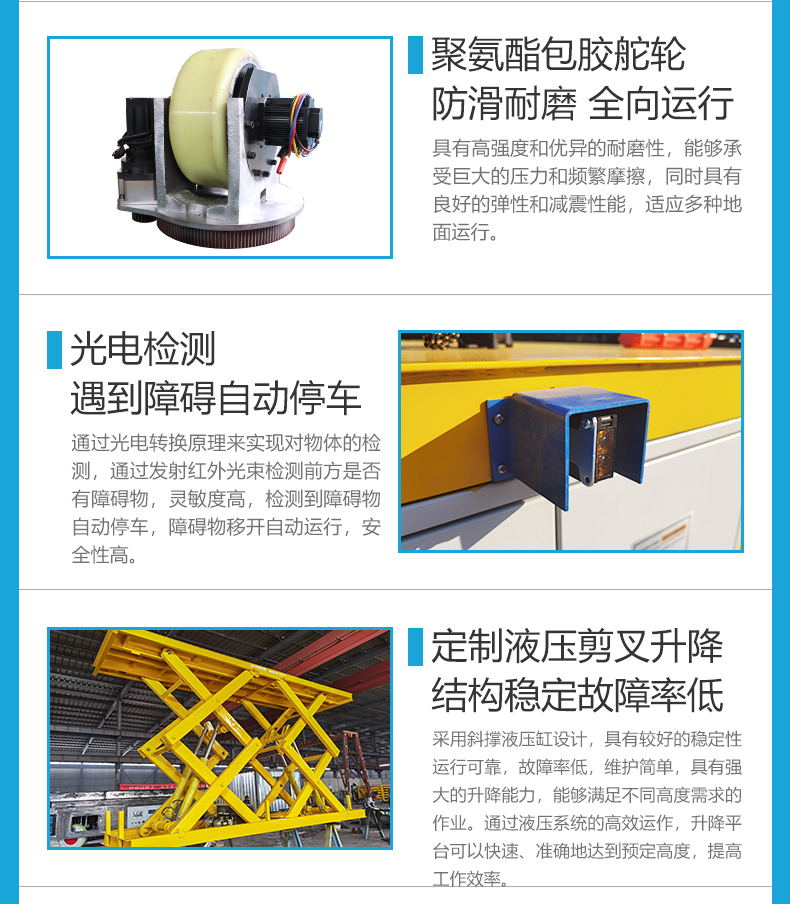 维修简单智杰优搬运为铁路隧道施工定制的10吨升降全向无轨搬运车,整车长6米宽2.4米高1.3米额定载重10吨。台面加装大型液压剪叉升降装置定制动力单元升降行程2.4米,无线遥控操作上下升降简单灵活,轮系配备舵轮搭配万向轮可全向移动,舵轮转向稳定灵活控制精准,可实现纵横移动、原地旋转、米字斜行等运动控制,狭窄工况环境下可精准停靠完成顶升搬运作业,升降平台上方定制4个U型置物架,极限顶升状态下也能确保物料**!