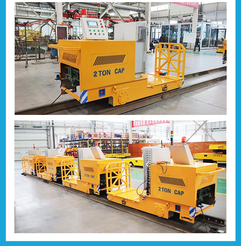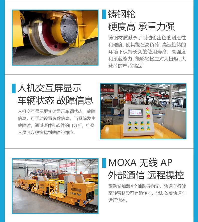 智杰优搬运研发生产的RGV智能轨道转运车,平台长2.6米宽0.9米高0.25米额定载重2吨,主要应用于手推小车及设备的换线使用。整车PLC控制预留端口可接入甲方总控,支持无线通信实现远程操作,该车通过RFID定位传感器接近开关,根据编程设定控制轨道车多点位自动停靠,伺服电机RGV专用减速机精准控制,自带编码器实时反馈定位精度高,定位精度可达正负5mm。轨道车采用磁力耦合式电缆卷筒供电,设有自动排线器防止电缆线缠绕,可满足生产线不间断连续作业,载货平台设有专用轨道,通过侧边设置RFID定位传感器对接信号自动停靠工位进行上下料,接近开关收放信号确认物料到位后自动抬起推杆防止运输过程中物料晃动,配备防腐防爆电气箱同时具备一定防水性能,人机交互显示屏实时显示车辆状态故障信息,可通过操作台按钮及线控手柄可进行手动操作,轨道车设有离合器,在断电状态下可进行人工推动,**装置设置三色报警灯、声光报警灯、大范围雷达检测,遇到障碍自动停车,确保行车**。RGV智能轨道车的运用,实现物料转运的自动化、产线操作大幅减轻操作人员劳动强度提高运输效率!