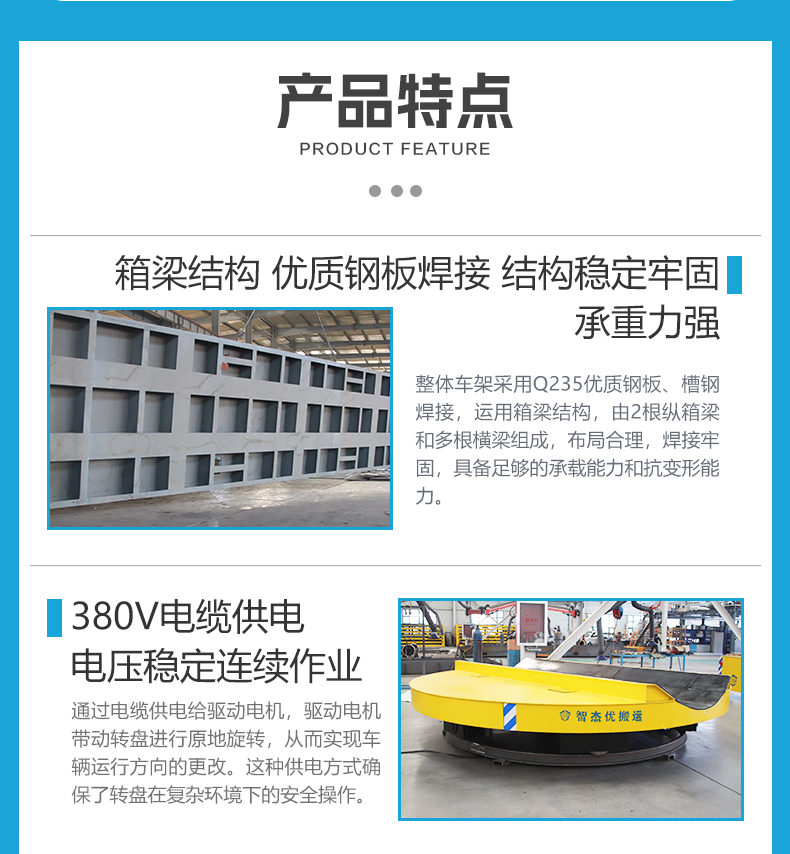 智杰优搬运带大家了解一款直径3.5米载重15吨的电动转盘旋转台,客户用于直径1.5米长10米的圆柱形结构物料的原地掉头作业,平台上方设置椭圆形凹槽方便物料放置,上方铺设10cm厚橡胶防滑垫,防止在旋转过程中物料晃动避免划伤物料,通过设置限位开关双重限位,旋转到180度自动先减速再缓慢停车,无线遥控控制转盘正反转操作简单方便,采用电机减速机驱动,启动平稳缓慢无冲击,380V电缆线供电不受蓄电池容量限制,可全天候连续作业,旋转速度可调节,设有高中低三个档位,电磁制动断电自动刹车,声光报警时刻提醒工作人员注意避让**性高,结构稳定维护简单,电动转盘的运用,帮助客户解决长物料掉头难的问题节省人力提升效率,智杰优搬运专注各种类型搬运设备非标定制,咨询我获取同款车型报价!