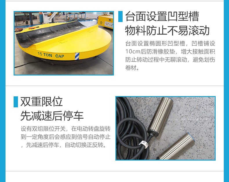 维修简单直径3.5米载重15吨的电动转盘旋转台,客户用于直径1.5米长10米复合材料卷的原地掉头作业,平台上方设置椭圆形凹槽方便物料放置,上方铺设10cm厚橡胶防滑垫,防止在旋转过程中物料晃动避免划伤物料,通过设置限位开关双重限位,旋转到180度自动先减速再缓慢停车,无线遥控控制转盘正反转操作简单方便,采用电机减速机驱动,启动平稳缓慢无冲击,380V电缆线供电不受蓄电池容量限制,可全天候连续作业,旋转速度可调节,设有高中低三个档位,电磁制动断电自动刹车,声光报警时刻提醒工作人员注意避让**性高,结构稳定维护简单,电动转盘的运用,帮助客户解决长物料掉头难的问题节省人力提升效率,智杰优搬运专注各种类型搬运设备非标定制,咨询我获取同款车型报价!