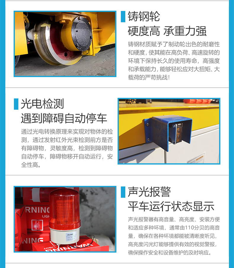 整车长4米宽1.6米高0.5米额定载重1吨,客户用于生产线零部件的转运。高强钢车架箱梁结构稳定牢固承重力强,工业蓄电池供电可根据运行时间定制电池容量,轨道运行稳定可靠。高硬度铸钢车轮耐磨损寿命长,支持遥控/手柄多模式操控,灵活适配生产需求。配备声光报警、断电保护、紧急制动、光电检测,全面守护作业**。轨道式电动平车多种供电方式可供选择,蓄电池、滑触线、低压轨道、电缆卷筒。