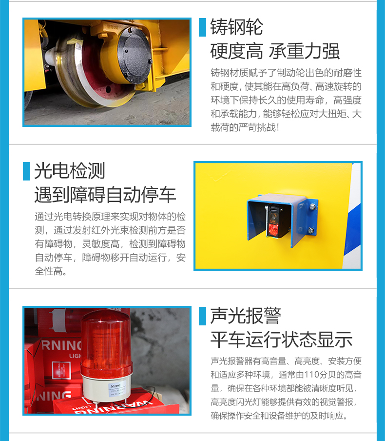 电动轨道牵引车+无动力拖车车组,通过前方牵引车带动后方无动力拖车及货物平稳运行。高强钢车架箱梁结构稳定牢固。搭载高密度工业牵引蓄电池,结合高效减速机电机驱动系统,输出扭矩强劲稳定,轻松牵引拖车及货物。配备工业级无线遥控系统,操作简单方便。适用于喷漆房、喷砂房、地铁隧道内牵引施工材料及设备等工况,牵引车适配性强应用灵活,模块化设计维护简单,节省人力物力提高效率。**装置设置光电检测,检测到障碍物自动停车,前后设有极限限位,可实现定点停车。