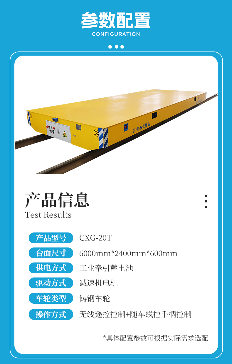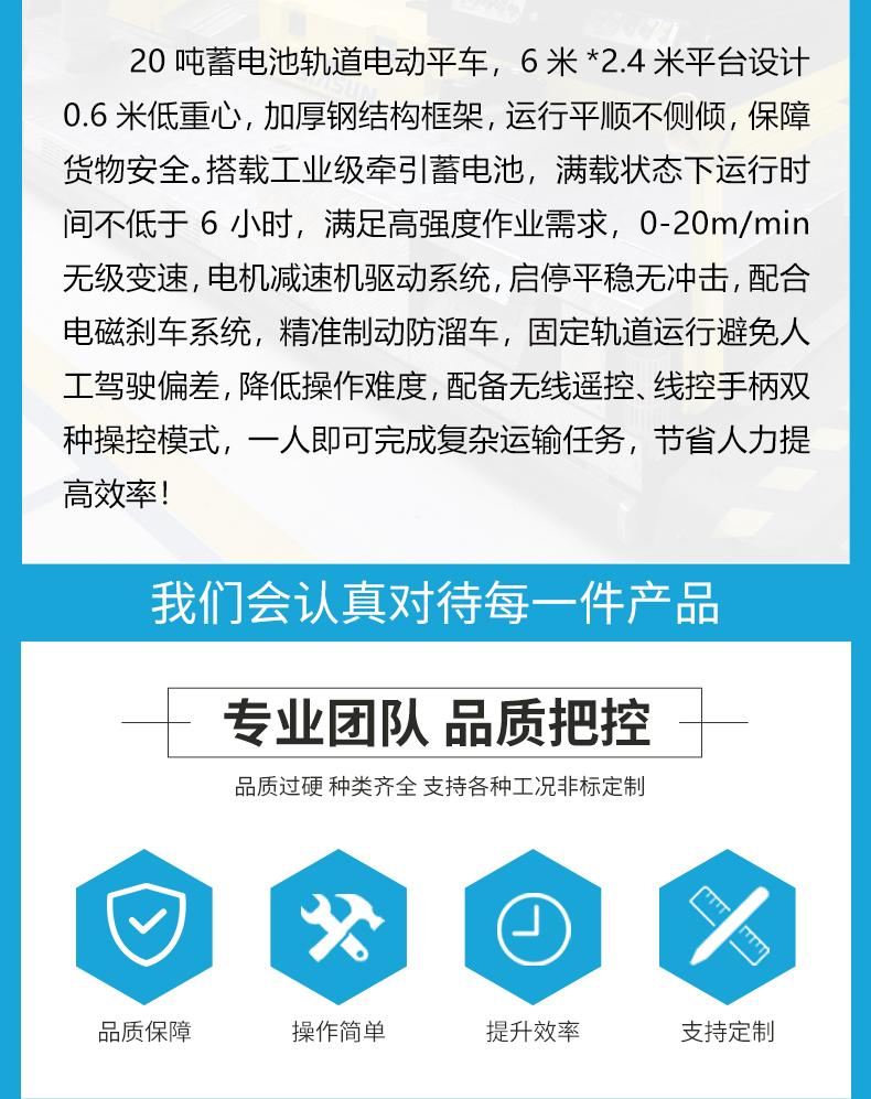 20吨蓄电池轨道电动平车,6米*2.4米平台设计 0.6米低**,加厚钢结构框架,运行平顺不侧倾,保障货物**。搭载工业级牵引蓄电池,满载状态下运行时间不低于6小时,满足高强度作业需求,0-20m/min无级变速,电机减速机驱动系统,启停平稳无冲击,配合电磁刹车系统,精准制动防溜车,固定轨道运行避免人工驾驶偏差,降低操作难度,配备无线遥控、线控手柄双种操控模式,一人即可完成复杂运输任务,节省人力提高效率!