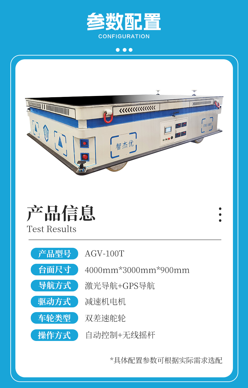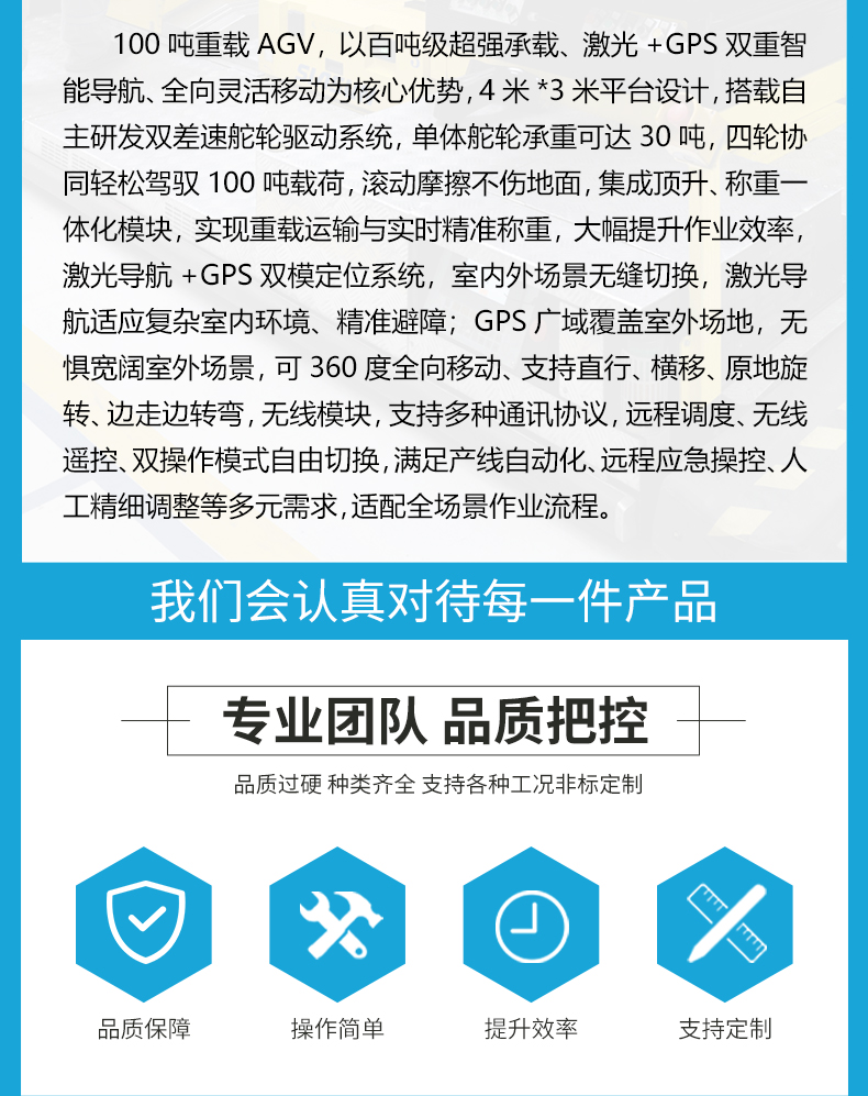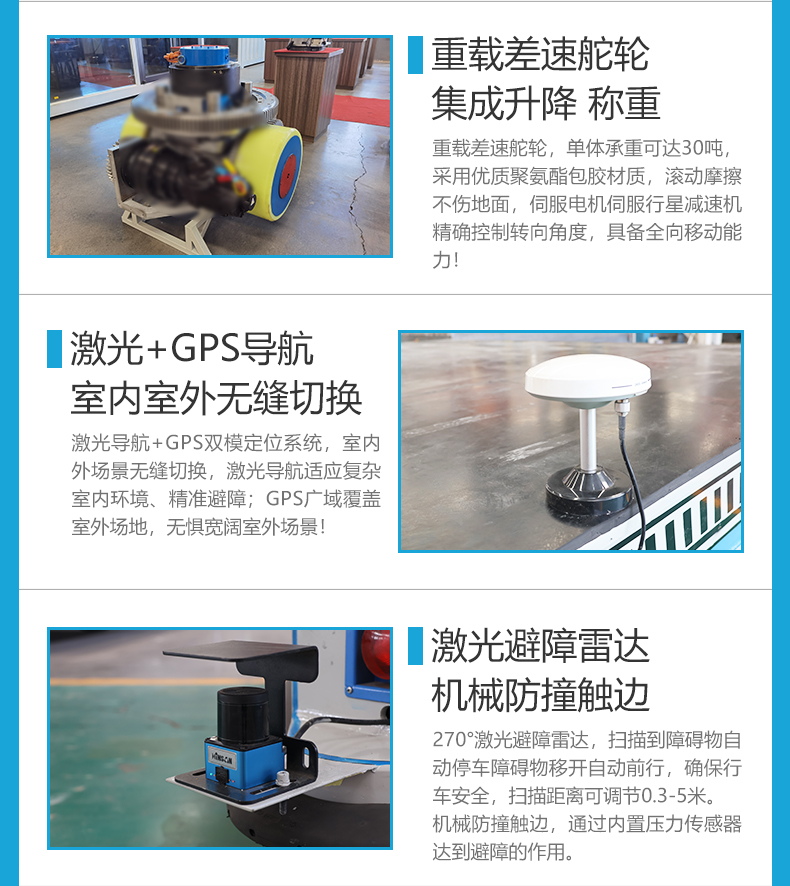 100吨重载AGV以百吨级超强承载、激光+GPS双重智能导航、全向灵活移动为核心优势,为工业重型物料转运提供新的解决方案。4米*3米平台设计,搭载自主研发双差速舵轮驱动系统,单体舵轮承重可达30吨,四轮协同轻松驾驭100吨载荷,滚动摩擦不伤地面,集成顶升、称重一体化模块,实现重载运输与实时精准称重,大幅提升作业效率,激光导航+GPS双模定位系统,室内外场景无缝切换,激光导航适应复杂室内环境、精准避障;GPS广域覆盖室外场地,无惧宽阔室外场景,可360度全向移动,4米车身也可在狭窄空间内灵活移动,无线模块支持多种通讯协议,远程调度,适配全场景作业流程,避障雷达让重载场景**加倍!