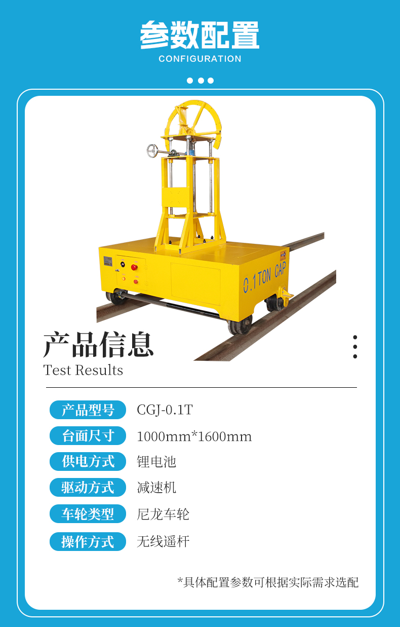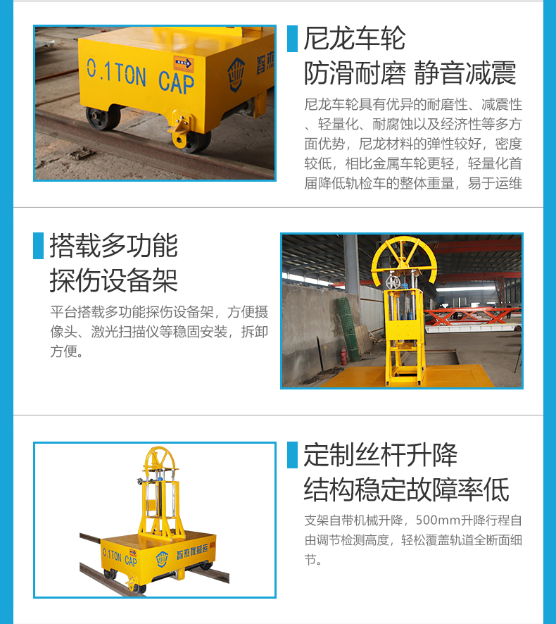 专为地铁轨道巡检场景设计,1米*1.6米紧凑车身轻松应对狭窄空间,车架采用铝合金材质兼顾轻量化与高强度,整车模块化设计可快速拆装,运输部署灵活便捷,大幅降低运维人力成本。平台定制可搭载多功能探伤设备支架,支持摄像头、激光扫描仪等仪器稳固安装,支架自带机械升降,500mm升降行程自由调节检测高度,轻松覆盖轨道全断面细节,无极调速启停平稳,内置高能锂电池组,可满足3小时续航需求,无线遥控操作简单方便,