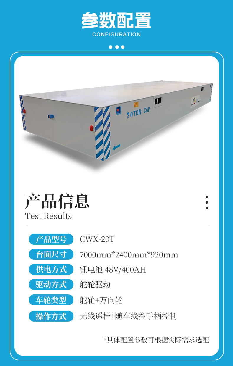 20吨全向移动无轨平板车,7米*2.4米宽大平台0.9米定制高度,高强钢焊接稳定牢固轻松承载重型设备、大型模具,轮系配备2个高性能聚氨酯包胶舵轮+2个万向轮组合,配合精密伺服电机减速机驱动动力澎湃输出稳定,集前进后退、左右转弯、纵横移动、米字斜行、原地旋转于一身,聚氨酯材质耐磨静音不伤地面。无线摇杆+有线手柄两种操作模式简单方便上手快,光电检测系统实时扫描障碍物,遇障自动停车确保货物人员**。