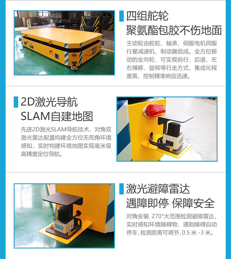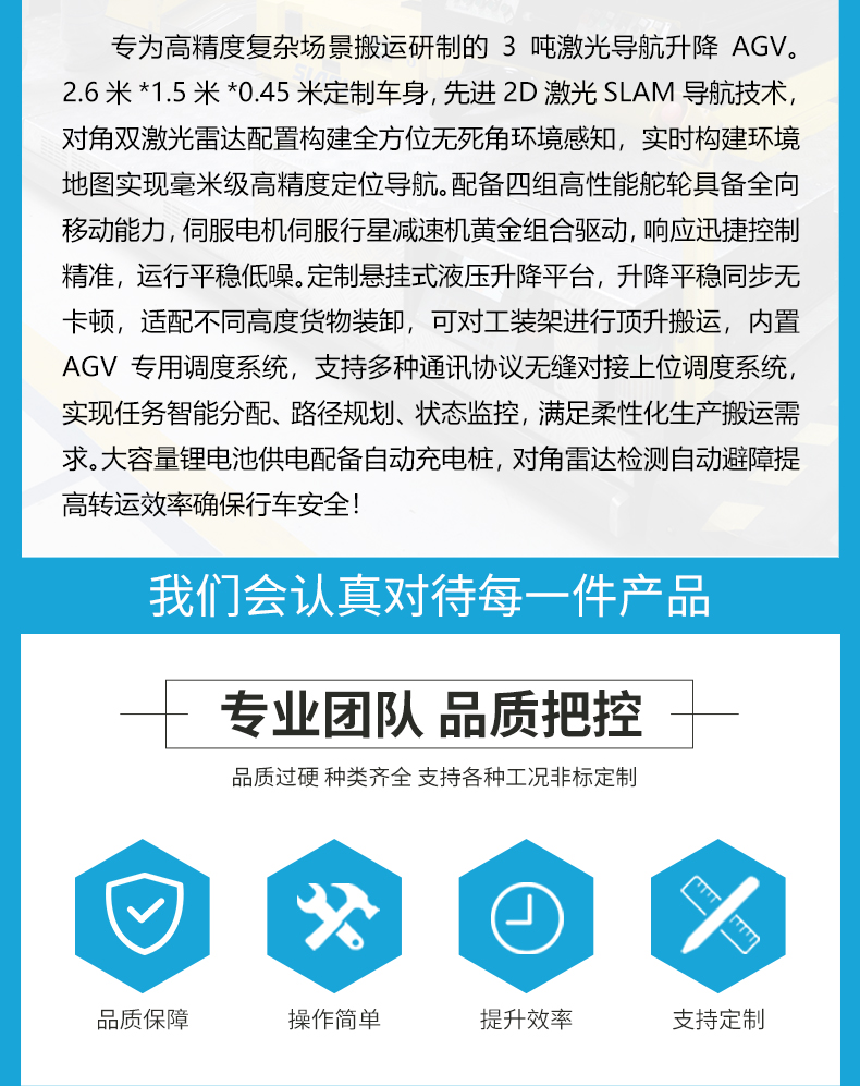 专为高精度复杂场景搬运研制的3吨激光导航升降AGV。2.6米*1.5米*0.45米定制车身,先进2D激光SLAM导航技术,对角双激光雷达配置构建全方位无死角环境感知,实时构建环境地图实现毫米级高精度定位导航。配备四组高性能舵轮具备全向移动能力,伺服电机伺服行星减速机黄金组合驱动,响应迅捷控制精准运行平稳低噪。定制悬挂式液压升降平台,升降平稳同步无卡顿,适配不同高度货物装卸,可对工装架进行顶升搬运,内置AGV专用调度系统,支持多种通讯协议无缝对接上位调度,实现任务智能分配、路径规划、状态监控,满足柔性化生产搬运需求。大容量锂电池供电配备自动充电桩,对角雷达检测自动避障提高转运效率确保行车**。
