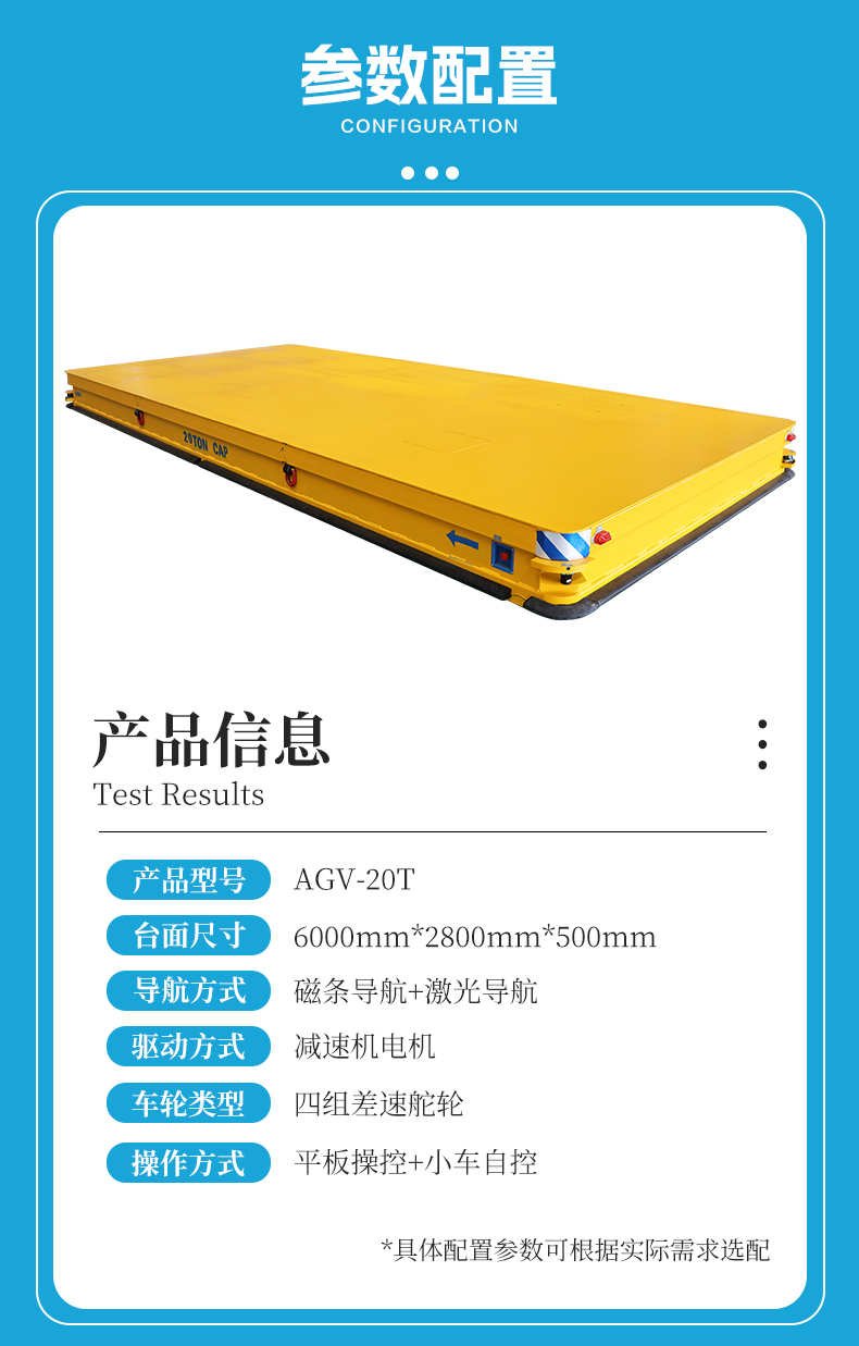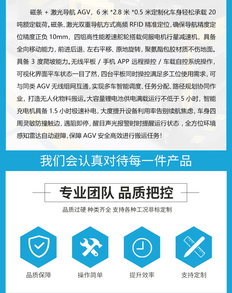 磁条+激光导航AGV,6米*2.8米*0.5米定制化车身轻松承载20吨额定载荷。磁条、激光双重导航方式高频RFID精准定位,确保导航精度定位精度正负10mm,四组高性能差速舵轮搭载伺服电机行星减速机,具备全向移动能力,前进后退、左右平移、原地旋转,聚氨酯包胶材质不伤地面。具备3度爬坡能力。无线平板/手机APP远程操控/车载自控系统操作,可视化界面平车状态一目了然,四台平板同时操控满足多工位使用需求,可与同类AGV无线组网互通,实现多车智能调度、任务分配、路径规划协同作业,打造无人化物料搬运。大容量锂电池供电满载运行不低于5小时,智能充电机具备1.5小时极速补电,大度提升设备利用率告别续航焦虑,车身四周灵敏防撞触边,遇阻即停,醒目声光报警时时提醒运行状态 ,全方位环境感知雷达自动避障,保障AGV**高效进行搬运任务!