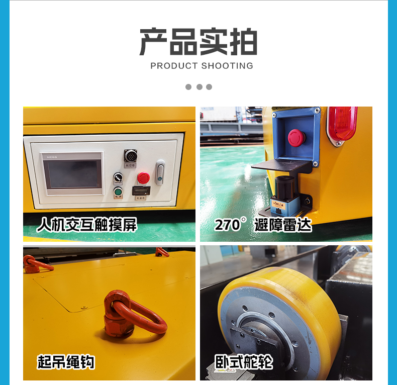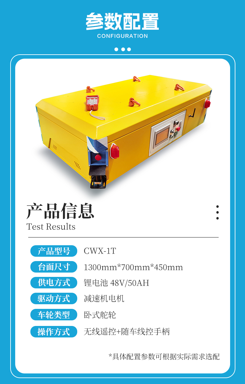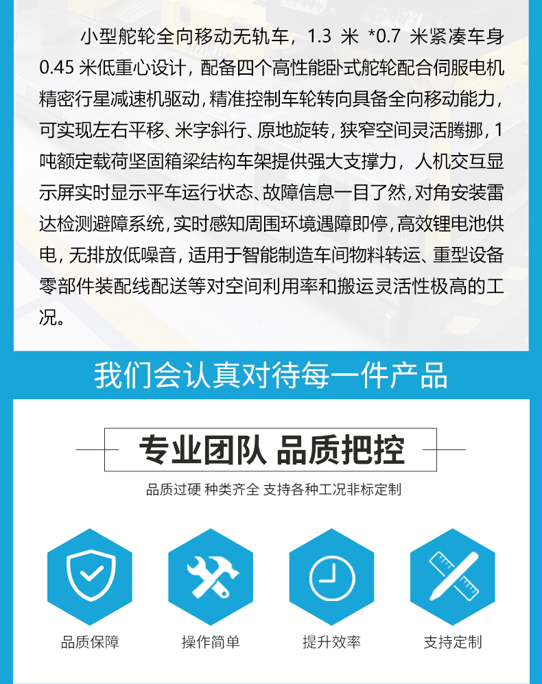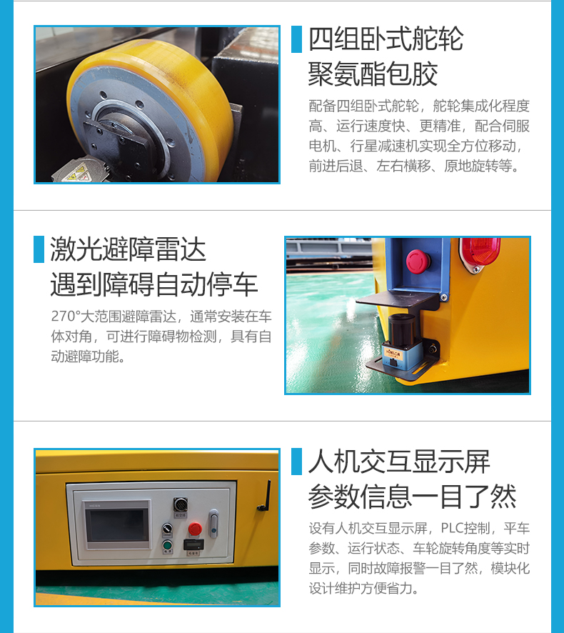 小型舵轮全向移动无轨车,1.3米*0.7米紧凑车身0.45米低**设计,配备四个高性能卧式舵轮配合伺服电机精密行星减速机驱动,精准控制车轮转向具备全向移动能力,可实现左右平移、米字斜行、原地旋转,狭窄空间灵活腾挪,1吨额定载荷坚固箱梁结构车架提供强大支撑力,人机交互显示屏实时显示平车运行状态、故障信息一目了然,对角安装雷达检测避障系统,实时感知周围环境遇障即停,高效锂电池供电,无排放低噪音,适用于智能制造车间物料转运、重型设备零部件装配线配送等对空间利用率和搬运灵活性极高的工况。