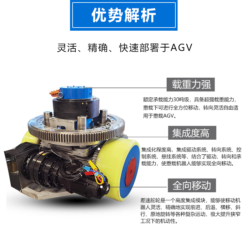 AGV重载舵轮是专为高负载自动化场景设计的驱动单元,集驱动、转向和承载功能于一体,适用于高负荷、高精度要求的工业环境,智杰优自主研发生产的30吨重载双差速舵轮,集成升降、称重等功能于一身,无需额外举升模块,节省空间与成本,双驱动轮通过齿轮传动实现差速驱动,滚动摩擦的旋转方式,降低阻力不伤地面,提升地面适应性。适配专用控制器实现精准转向与速度控制,配置编码器实时监测转向角度,提升控制精度,可驱动AGV车辆进行前进、横移、斜行、原地旋转等运动控制,满足工业重载自动化搬运需求!