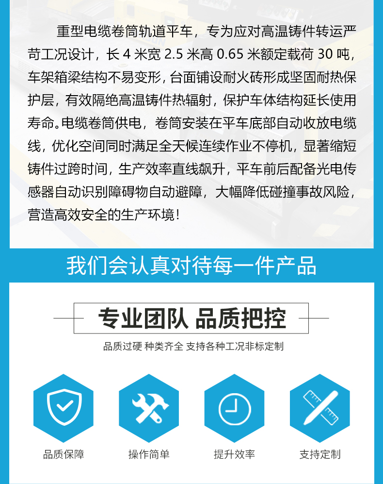 重型电缆卷筒轨道平车,专为应对高温铸件转运严苛工况设计,长4米宽2.5米高0.65米额定载荷30吨,车架箱梁结构不易变形,台面铺设耐火砖形成坚固耐热保护层,有效隔绝高温铸件热辐射,保护车体结构延长使用寿命。电缆卷筒供电,卷筒安装在平车底部自动收放电缆线,优化空间同时满足全天候连续作业不停机,显著缩短铸件过跨时间,生产效率直线飙升,平车前后配备光电传感器自动识别障碍物自动避障,大幅降低碰撞事故风险,营造高效**的生产环境!
