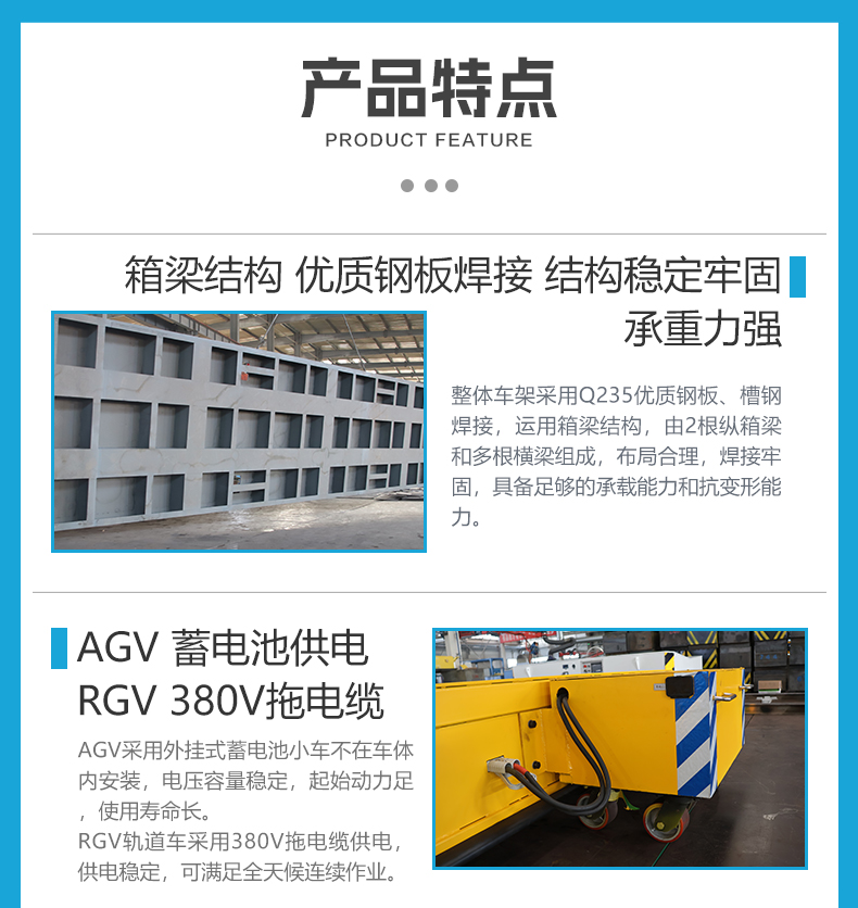 AGV/RGV公铁两用电动平板搬运车,一车双用,打破场景限制! 3.5米*3.2米宽大平台0.55米低**设计6吨级额定载荷,柔性生产线物料自由配送与跨区域重型部件轨道转运一车搞定。平车集成双套电控系统,AGV控制系统集成在车内,RGV控制系统集成于甲方控制柜,预留端口支持外部通讯可由甲方总控远程控制RGV轨道车运行。小车配备8套行走装置,AGV模式下4套高性能聚氨酯包胶舵轮,支持360度全向移动能力静音运行不伤地面,RGV模式下4组高强度铸钢车轮承载力强运行平稳,转换开关一键上下升降完成换轨,轻松跨越公铁轨道界限,AGV采用可拆卸独立蓄电池小车供电作业自由无拘束,RGV采用拖电缆供电满足全天候连续作业不停机,车身四周配备机械防撞触边遇障即停,为人员、设备及货物构筑全方位**屏障,一车两用助力企业**搬运降本增效!