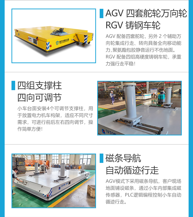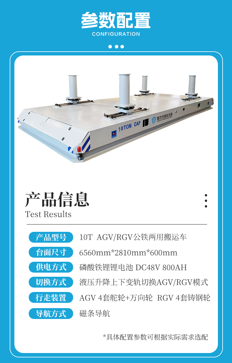 既能在地面上全向移动又能瞬时切换**轨道稳定运行的搬运车你见过吗?这是一款10吨级公铁两用自动导航运输车,集地面灵动与轨道稳定于一身为电力机车构架转运提供高效智能的搬运解决方案!AGV模式下磁条导航精准循迹自动行走,无线摇杆全向掌控具备90°直角掉头、纵横移动、米字斜行、原地旋转移动能力,配备舵轮辅助万向轮,3KW大扭矩伺服电机动力澎湃从容跨越60mm轨道沟与10mm高差地面,台面定制四个可调节支撑柱适配不同尺寸构架确保运输过程稳固不滑落,通过液压升降系统一键切换轨道模式,四组铸钢车轮平稳降轨,省去设备转换与吊装环节大幅压缩转运时间,车身对角270°避障雷达实时感知环境、声光报警、急停按钮构筑多重**防线,IP65防护等级无惧车间油污粉尘室外雨雪天气,800A大容量锂电池提供超长续航,提升重型部件转运效率保障作业**!
