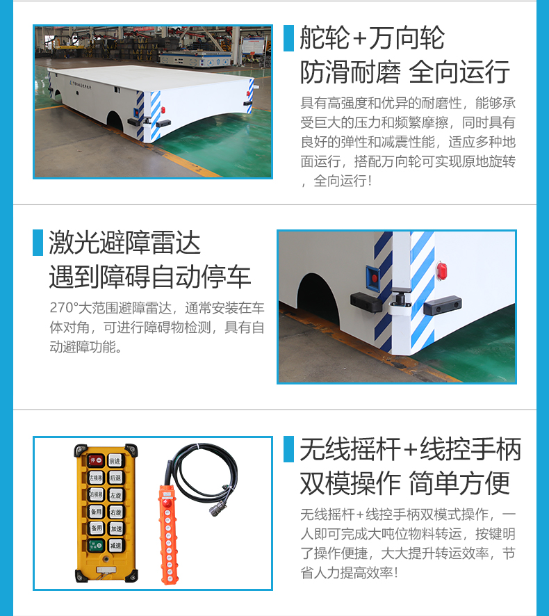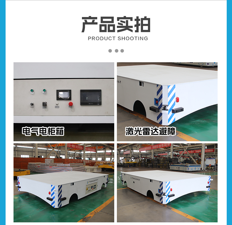 20吨物料周转无轨平车,长4米宽2.5米高0.75米额定载荷20吨,用于车间原材料、大型工件等物料搬运过跨。车架箱梁结构坚固耐用,承重不变形不塌陷。轮系配备舵轮万向轮,配合伺服电机行星减速机精确控制转向角度,具备360°全向移动能力,左右横移、原地旋转大大节省腾挪空间,搭载500Ah大容量锂电池组,提供长时间续航能力,满足高强度作业需求。电气系统预留自动化接口及导航模块安装位置,对接未来AGV升级需求,多重**防护大范围避障雷达遇障即停、醒目声光报警运行状态清晰提示、急停开关突发状况一键刹停,全方位多角度保障平车运行**,为您的生产和人员保驾护航!