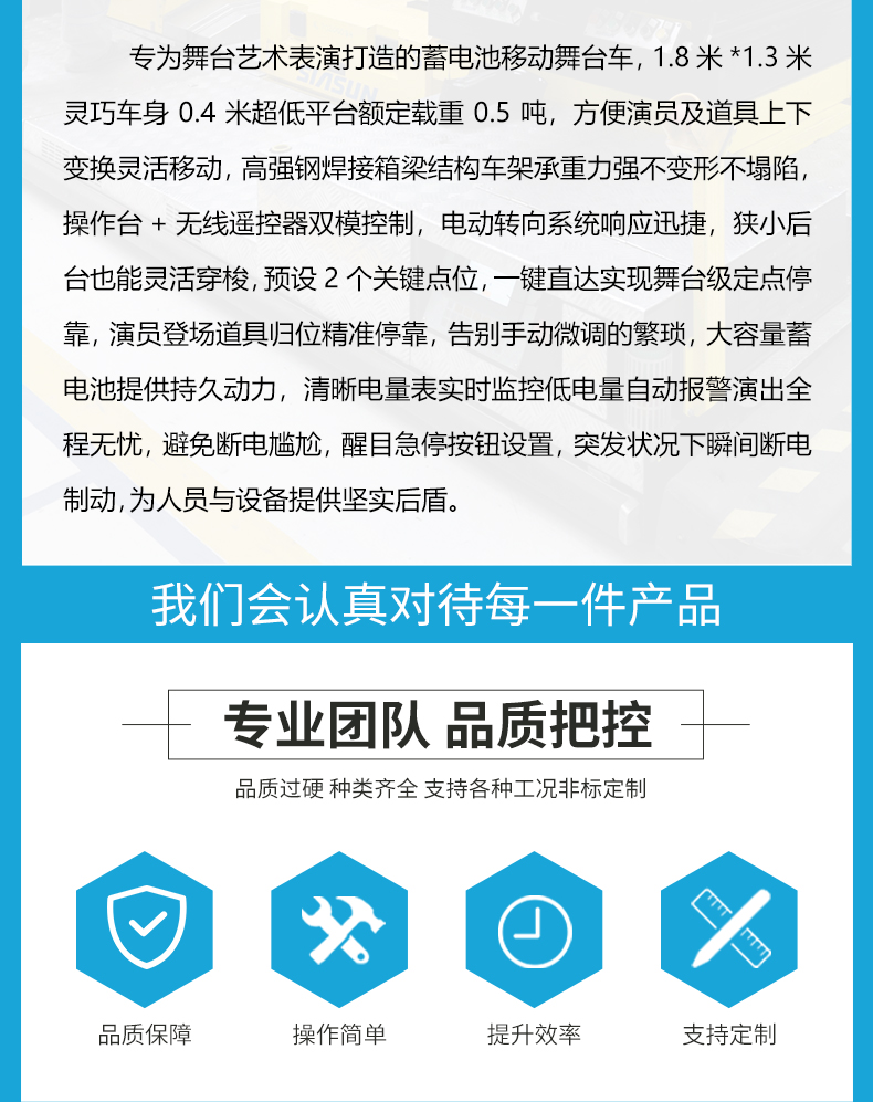 这款专为舞台艺术打造的蓄电池移动舞台车,以1.8米*1.3米精巧车身0.4米超低平台额定载重0.5吨,成为您幕后精准调度的秘密武器!预设两个关键点位,一键直达自动停靠,演员缓缓登场,赋予演出灵动生命力,适用于剧院、演唱会、电视台演播厅、大型文艺晚会等各类需要精准、安静、可靠移动解决方案的场景。