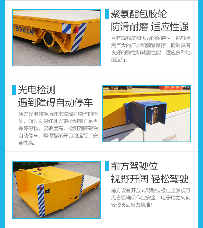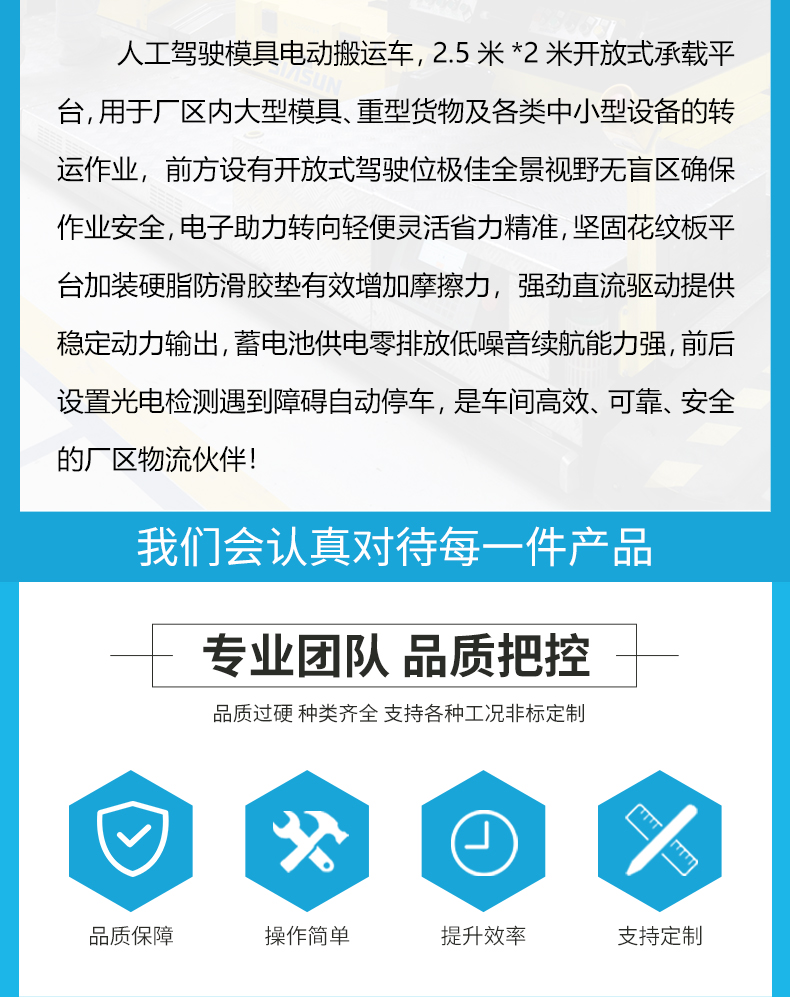 人工驾驶模具电动搬运车,2.5米*2米开放式承载平台,用于厂区内大型模具、重型货物及各类中小型设备的转运作业,前方设有开放式驾驶位**全景视野无盲区确保作业**,电子助力转向轻便灵活省力精准,坚固花纹板平台加装硬脂防滑胶垫有效增加摩擦力,强劲直流驱动提供稳定动力输出,蓄电池供电零排放低噪音续航能力强,前后设置光电检测遇到障碍自动停车,是车间高效、可靠、**的厂区物流伙伴!