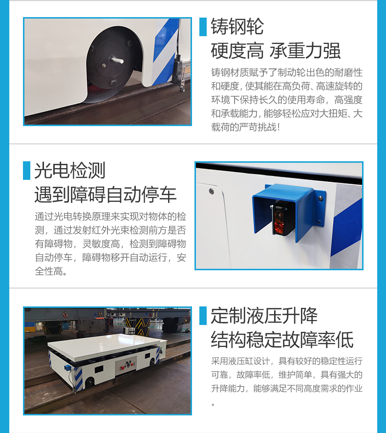 智能升降轨道搬运车,长1.9米宽1.2米高0.48米紧凑车身额定载荷6吨,箱梁结构高强钢焊接承载力强,应对车间各种重型工件、模具的搬运任务。台面内置液压升降模块,可实现80mm行程的整体平稳升降,适用于不同高度生产线、模具安装定位、以及需要精密对位的装配场景,遥控一键升降极大提升灵活性,锂电池组供电配备自动碰撞式充电机具备满电自停功能,无需人工干预解放人力,PLC智控系统,支持编程通过接近开关实现多点位自动停靠,更可连接上位机进行集中控制与调度,轻松融入您的智能工厂管理系统,实现自动化流水线作业!