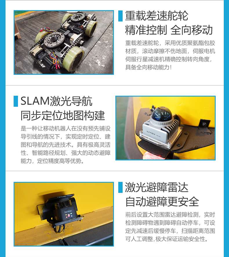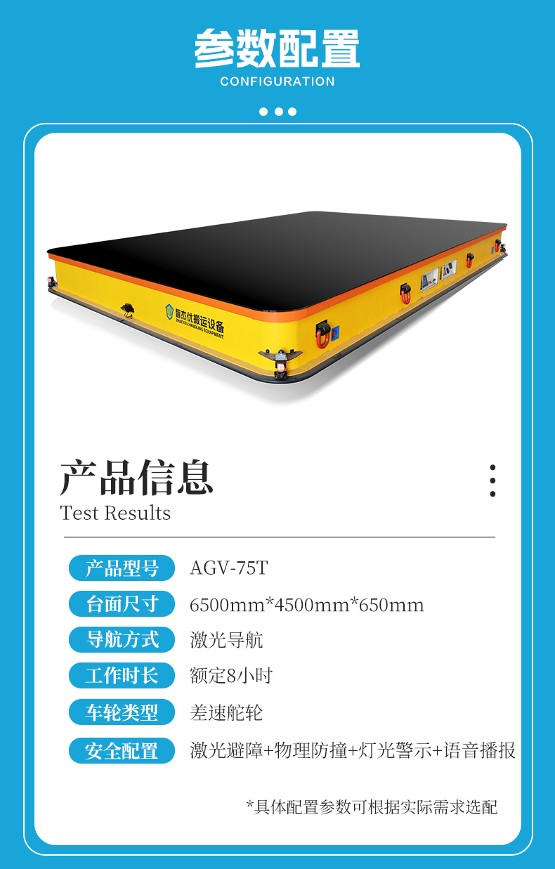 激光导航重载AGV,长6.5米宽4.5米高0.65米额定载荷75吨,车架箱梁结构加厚钢板焊接,台面双层钢板确保平整度长期重载不变形不塌陷经久耐用。先进SLAM激光导航技术适应动态复杂环境,WiFi通讯全覆盖,实时接收调度指令,与MES、WMS系统对接实现多机协同作业,搭载四组双差速舵轮系统,配合伺服电机行星减速机编码器反馈,实现精准控制,360°全向移动可在狭窄空间内自由转向、横移,独立悬挂设计接地性强,运行平稳低噪,路径随时变更,产线调整更自由,实现厂内柔性物流,大容量锂电池组支持连续运行8小时,兼容自动碰撞充与手动插拔充电两种模式,低电量自动回充减少人工干预,激光避障、物理防撞条双重防护,实时感知障碍物并自动减速缓慢停车,声光报警智能语音播报,人机交互更直观,是大型模具转运、重型机械制造等物料转运的不二之选!