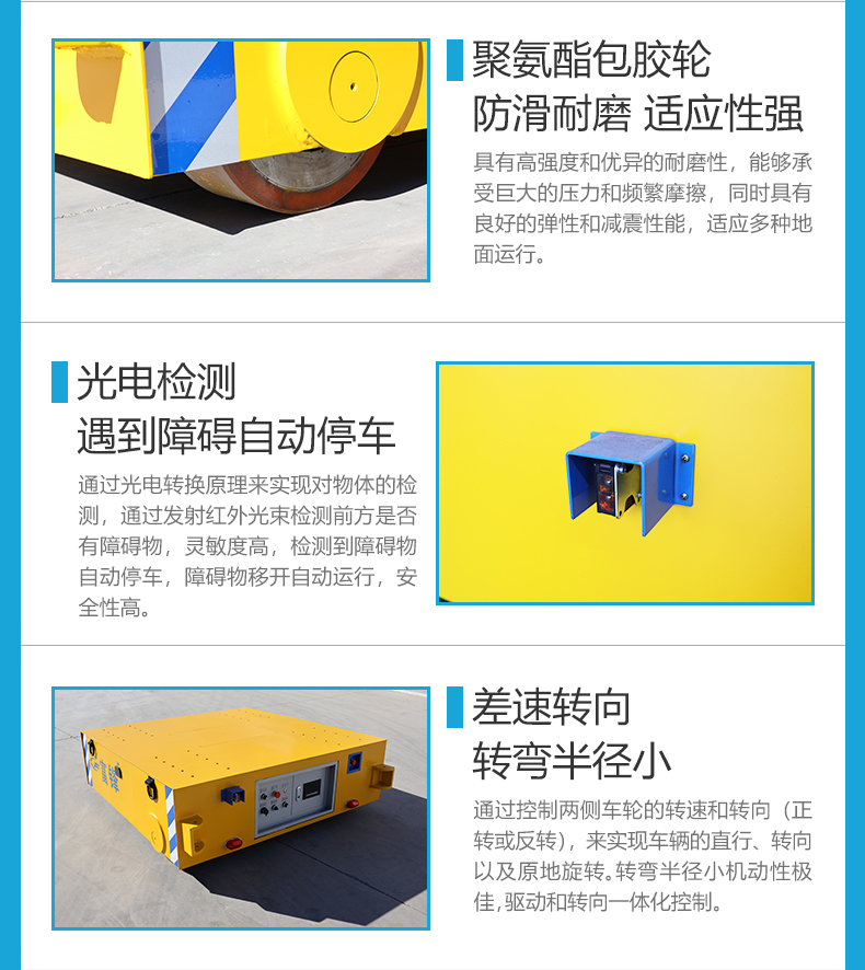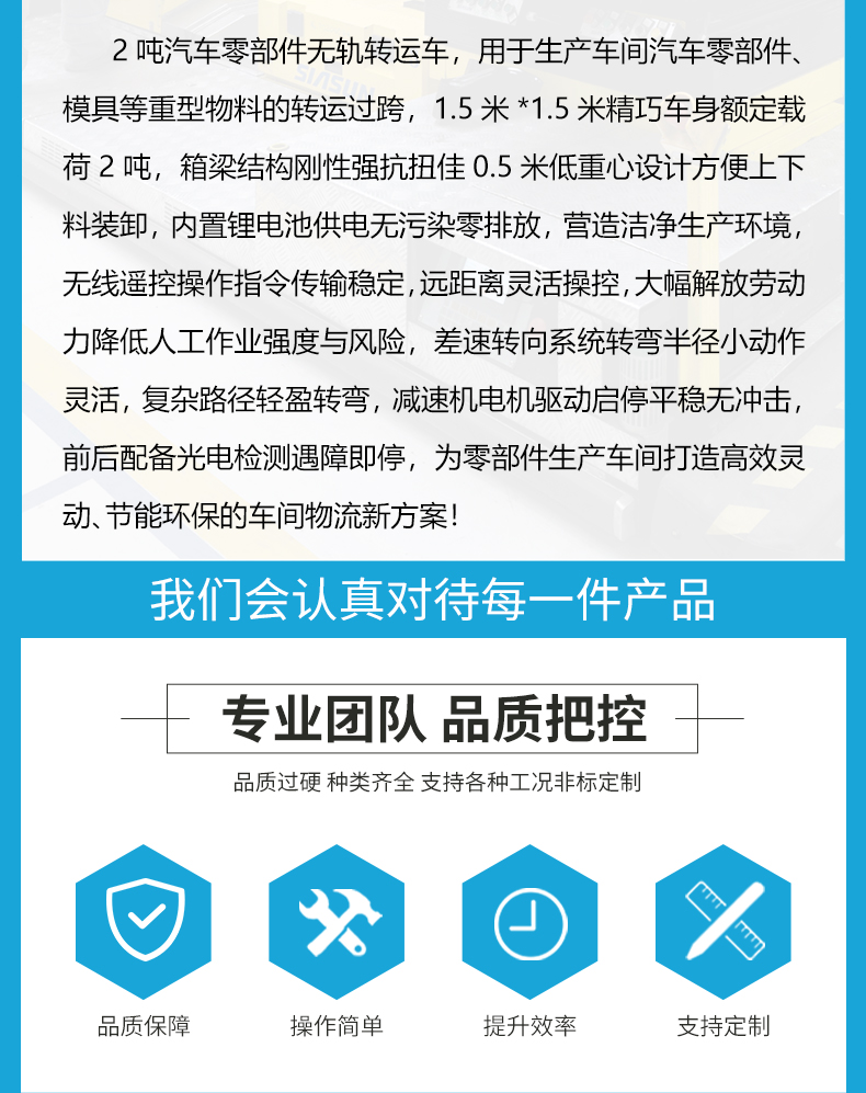 吉林客户批量订购的8台无轨转运车,3台额定载荷2吨,5台额定载荷10吨,用于生产车间汽车零部件、模具等重型物料的转运过跨,1.5米*1.5米精巧车身额定载荷2吨,箱梁结构刚性强抗扭佳0.5米低**设计方便上下料装卸,内置锂电池供电无污染零排放,营造洁净生产环境,无线遥控操作指令传输稳定,远距离灵活操控,大幅解放劳动力降低人工作业强度与风险,差速转向系统转弯半径小动作灵活,复杂路径轻盈转弯,减速机电机驱动启停平稳无冲击,前后配备光电检测遇障即停,为零部件生产车间打造高效灵动、节能环保的车间物流新方案!