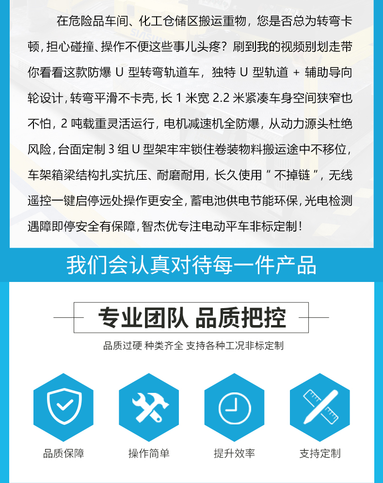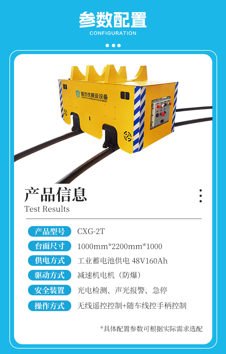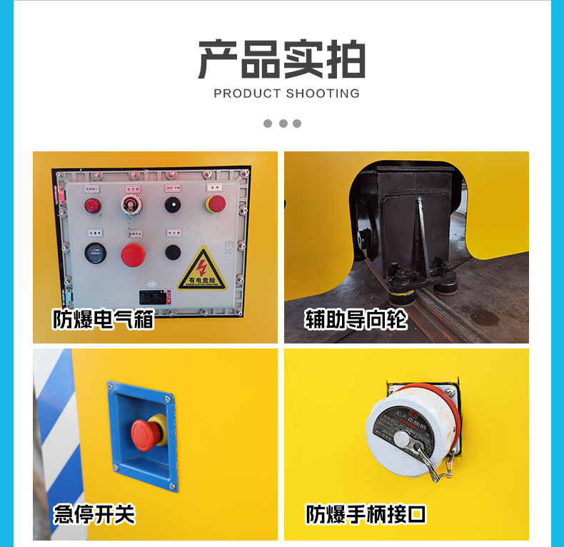 带你看看这款防爆U型转弯轨道车,独特U型轨道+辅助导向轮设计,转弯平滑不卡壳,长1米宽2.2米紧凑车身空间狭窄也不怕,2吨载重灵活运行,电机减速机全防爆,从动力源头杜绝风险,台面定制3组U型架牢牢锁住卷装物料搬运途中不移位,车架箱梁结构扎实抗压、耐磨耐用,长久使用“不掉链”,无线遥控一键启停远处操作更**,蓄电池供电节能环保,光电检测遇障即停**有保障!