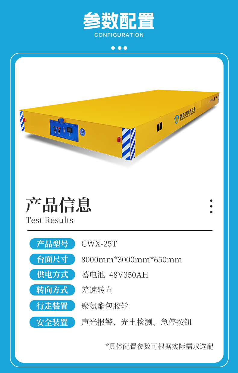 维修简单25吨差速转向工件运输车,长8米宽3米宽大平台,0.6米低**设计方便叉车、吊装作业,专为工件半成品跨车间运输设计,车架箱梁结构钢板焊接具备超强承载力与抗扭性,长期使用不变形不塌陷,减速机电机驱动,传动效率高起始动力足运行平稳流畅,差速转向灵活高效,聚氨酯包胶车轮不伤地坪,前后安装光电检测遇到障碍自动停车,有效预防碰撞事故,运行速度0-20米/min无级变速,满足多样化生产节拍需求,是车间内外物料过跨、替代传统低效搬运方式的高性价比之选!