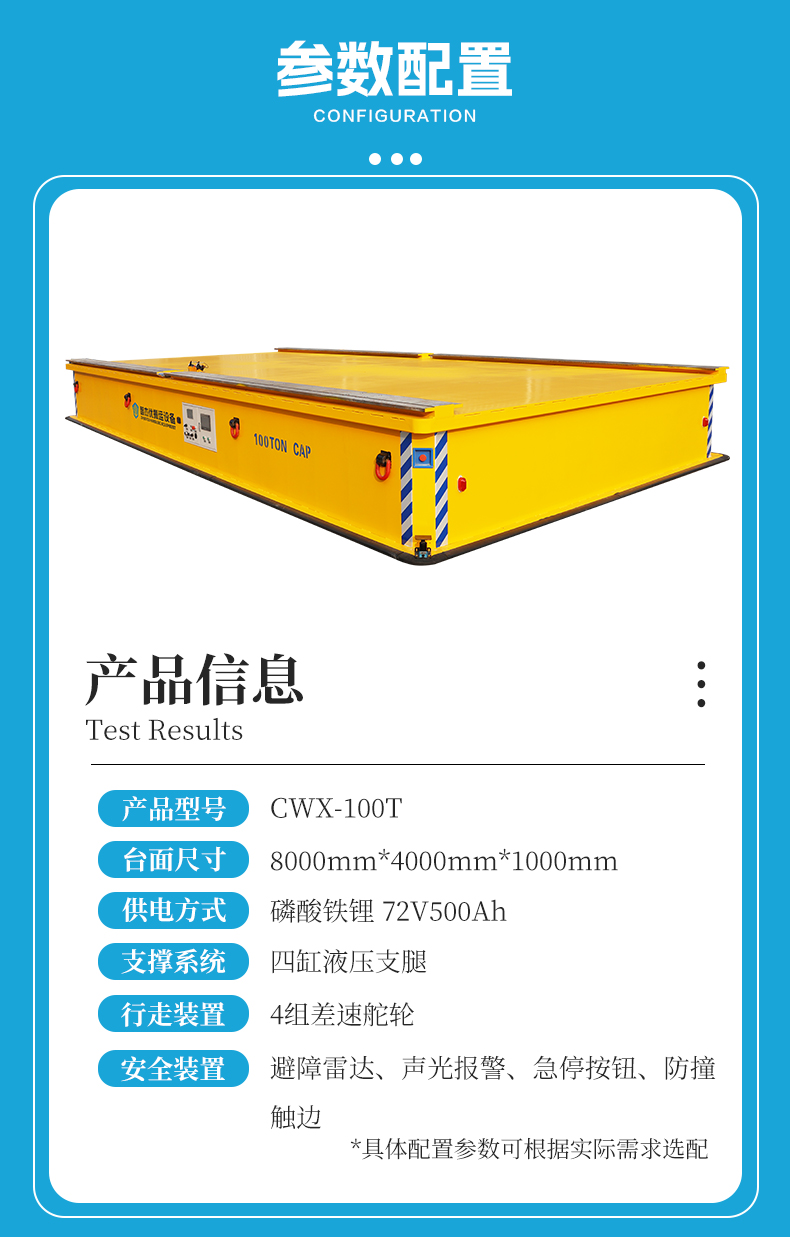 百吨级重型连续油管如何实现厂内外平稳转运?智杰优100吨差速舵轮全向无轨搬运车提供解决方案! 长8米宽4米额定载重100吨,四组差速舵轮,伺服电机行星减速机驱动传动精密高效,全向移动无死角运行灵活度直接拉满!四角定制液压升降支腿辅助驻车支撑,减少轮组压力提高支撑稳定性,锂电池供电满载续航1公里,多重**防护自动避障,助力企业高效**完成大吨位物料轻松转运!