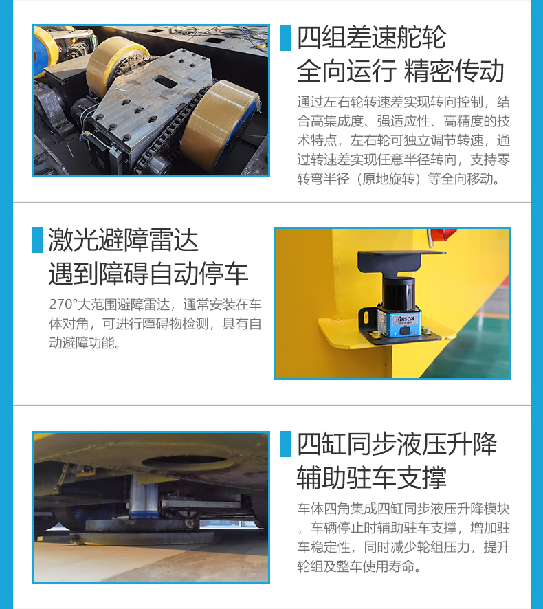智杰优100吨差速舵轮全向无轨搬运车提供解决方案,长8米宽4米超大车身1米定制高度,搭载四组精密差速舵轮,8台5KW伺服电机与行星减速机驱动传动精密高效,横向平移、斜向行进、原地零半径旋转全向运行灵活度拉满,四角定制液压升降支腿辅助驻车支撑,减少轮组压力增加使用寿命提升停靠稳定性,百吨级物料装卸提供稳定可靠平台,大容量锂电池供电满载连续运行1公里无压力,具备横向过轨与5°爬坡能力,台面焊接工装与物料合为一体转运平稳无晃动,对角布置两组避障雷达遇到障碍自动停车,四周防撞触边接触物体立即刹停,全方位守护重载转运**!