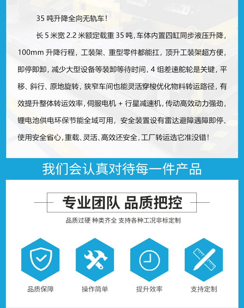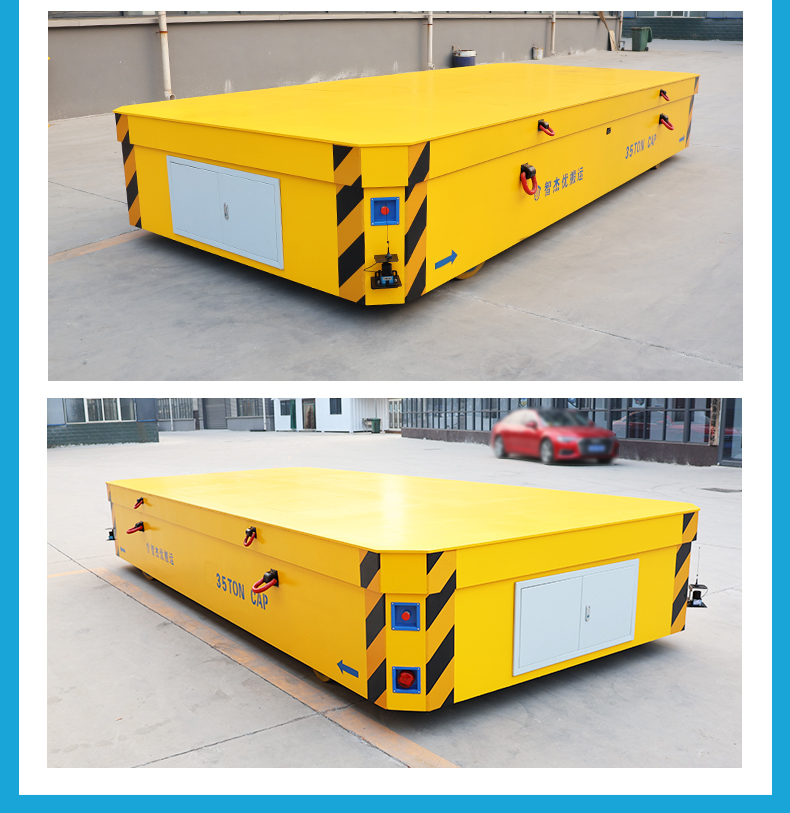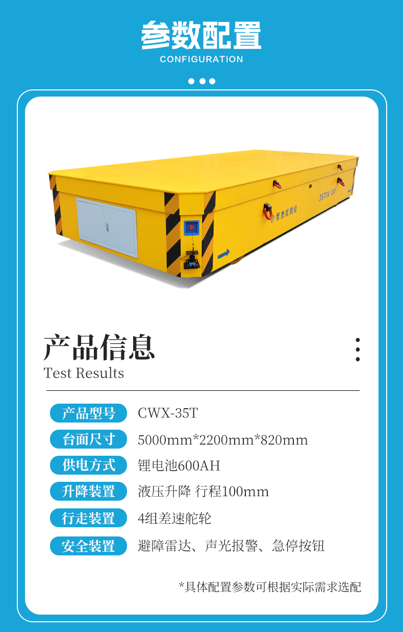 维修简单长5米宽2.2米额定载重35吨,车体内置四缸同步液压升降,100mm升降行程,工装架、重型零件都能扛,顶升工装架超方便,即停即卸,减少大型设备等装卸等待时间,4组差速舵轮是关键,平移、斜行、原地旋转,狭窄车间也能灵活穿梭优化物料转运路径,有效提升整体转运效率,伺服电机+行星减速机,传动高效动力强劲,锂电池供电环保节能全域可用,**装置设有雷达避障遇障即停、使用**省心,重载、灵活、高效还**,工厂转运选它准没错!